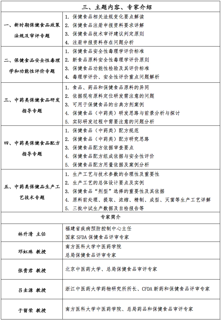 2018年6月1日-3日,我司組織的“中藥類保健食品研發(fā)與技術(shù)審評(píng)專題會(huì)”專題培訓(xùn)會(huì)在廈門成功舉辦。本次培訓(xùn)會(huì)邀請(qǐng)了林升清、鄧紅珠、張貴軍、呂圭源、于留榮五位CFDA權(quán)威評(píng)審專家出席。政策利好,加之我國(guó)豐富的中藥資源和源遠(yuǎn)流長(zhǎng)的“藥食同源”文化為中藥類保健食品的研發(fā)提供了基礎(chǔ)。但保健食品的安全性、功能性和質(zhì)量可控性仍是困擾產(chǎn)品研發(fā)及企業(yè)發(fā)展的關(guān)鍵所在。為此,我們特邀請(qǐng)行業(yè)知名專家召開(kāi)本次交流會(huì),并就法規(guī)、研發(fā)、配方、毒理安全、生產(chǎn)工藝等方面作專題答疑指導(dǎo)交流。