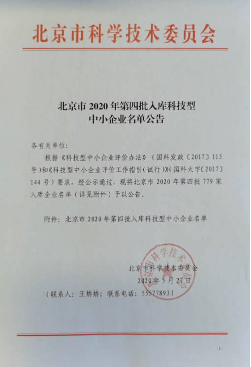 北京市科委根據(jù)《科技型中小企業(yè)評價辦法》(國科發(fā)政〔2017〕115號)和《科技型中小企業(yè)評價辦法指引(試行)》(國科火字〔2017〕114號)要求,公示通過北京市2020年 “科技型中小企業(yè)”,我公司再次成功入庫北京市全國科技型中小企業(yè)!。這是我公司研究開發(fā)服務取得的又一喜人成果,是我公司走科技型企業(yè)發(fā)展的一個巨大突破,是有關政府部門對我司研發(fā)和技術(shù)服務能力的認可。
