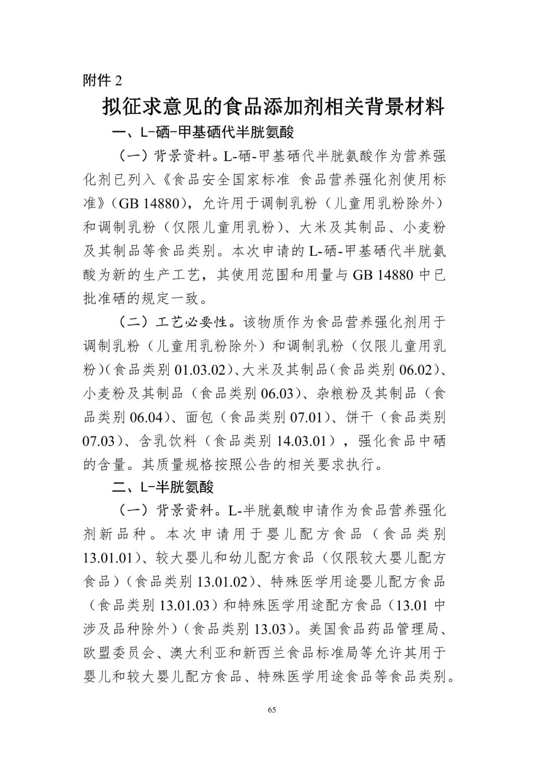 (1)L-硒-甲基硒代半胱氨酸的用量及使用范圍:L-硒-甲基硒代半胱氨酸的使用范圍和用量與 GB 14880《食品安全國家標(biāo)準(zhǔn) 食品營養(yǎng)強(qiáng)化劑使用標(biāo)準(zhǔn)》中已批準(zhǔn)硒的規(guī)定一致。