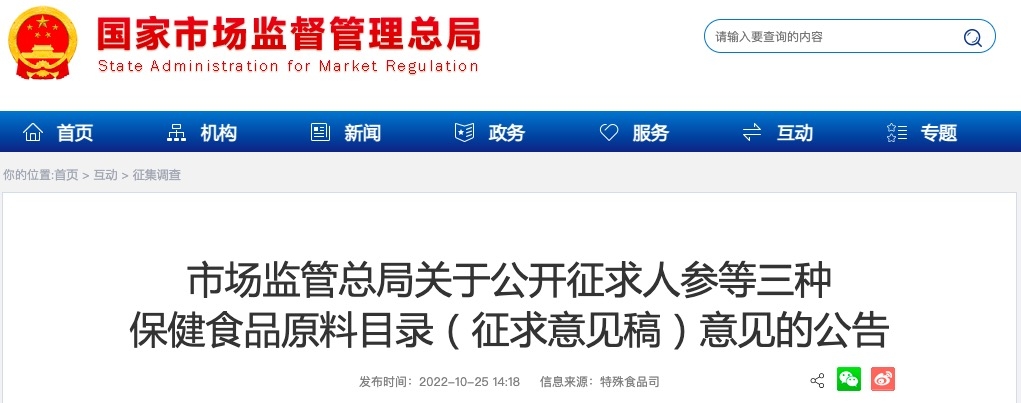為進(jìn)一步推進(jìn)保健食品備案工作,根據(jù)《中華人民共和國食品安全法》,市場監(jiān)管總局組織制修訂了人參等三種保健食品原料目錄(征求意見稿),現(xiàn)面向社會公開征求意見,意見建議反饋截止時間為2022年11月25日。公眾可以通過以下途徑和方式提出意見建議: