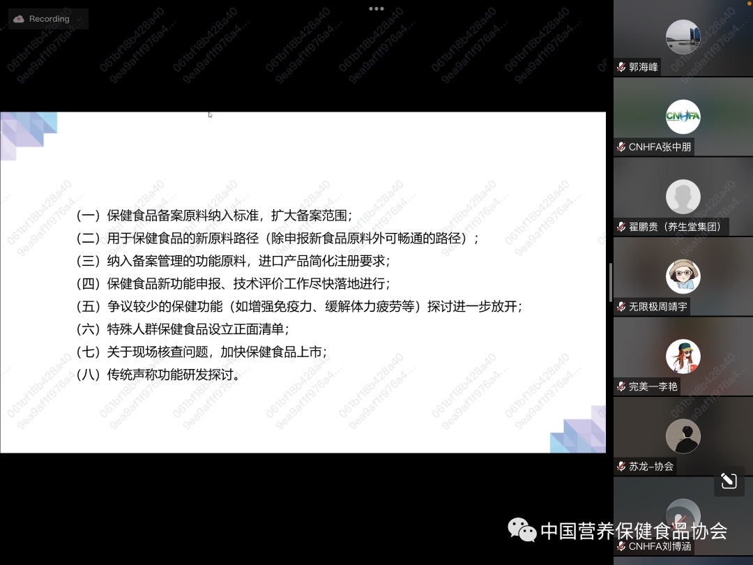 會議還邀請了雀巢、拜耳、赫力昂、湯臣倍健、安利、健合、康寶萊、珍奧、養(yǎng)生堂、無限極、仙樂健康、完美12家保健食品企業(yè)代表參會。會上企業(yè)代表們紛紛發(fā)言,就擴大保健食品備案范圍、新原料及新功能申報、特殊人群正面清單、現場核查、傳統功能聲稱等方面進行了討論并提出了意見建議。