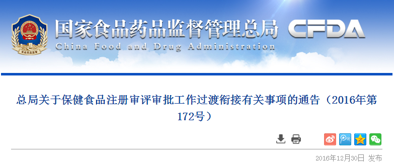 2016年11月15日,國(guó)家食品藥品監(jiān)督管理總局印發(fā)了《保健食品注冊(cè)審評(píng)審批工作細(xì)則(2016版)》(以下簡(jiǎn)稱《細(xì)則》),明確了保健食品注冊(cè)審評(píng)審批的工作程序和要求。為保證保健食品注冊(cè)審評(píng)審批工作平穩(wěn)有序開(kāi)展,現(xiàn)就《細(xì)則》實(shí)施前已受理注冊(cè)申請(qǐng)的審評(píng)審批事項(xiàng)通告如下: