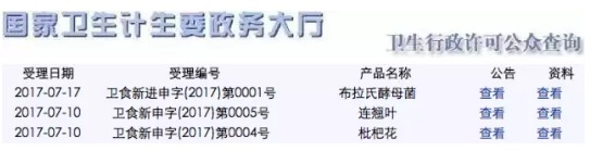 2017年07月20日,國(guó)家衛(wèi)計(jì)委新食品原料受理系統(tǒng)又有最新動(dòng)態(tài)。此次受理的新食品原料為枇杷花、連翹葉、布拉氏酵母菌,受理編號(hào)依次為:衛(wèi)食新申字(2017)第0004號(hào)、衛(wèi)食新申字(2017)第0005號(hào)、衛(wèi)食新進(jìn)申字(2017)第0001號(hào),擬公告內(nèi)容: