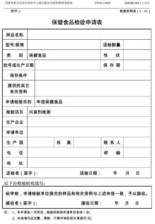 (二)《保健食品檢驗申請表》(見附件二)和《國家體育總局反興奮劑中心食品藥品興奮劑檢測實驗室樣品登記表》(見附件三)的填寫