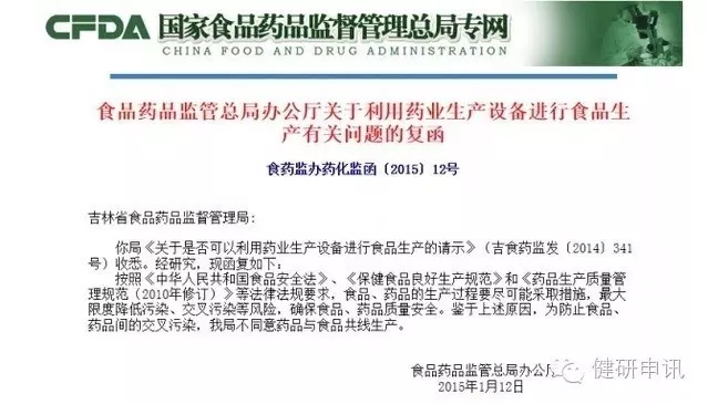 2016年9月,廣東省食藥監(jiān)局批復(fù)中山市食藥監(jiān)局“關(guān)于普通食品與保健食品共線(xiàn)生產(chǎn)的有關(guān)問(wèn)題”一函被公開(kāi)。此函中明確指出“未禁止普通食品與保健食品共線(xiàn)生產(chǎn),但同一車(chē)間不得同時(shí)生產(chǎn)不同的產(chǎn)品”。