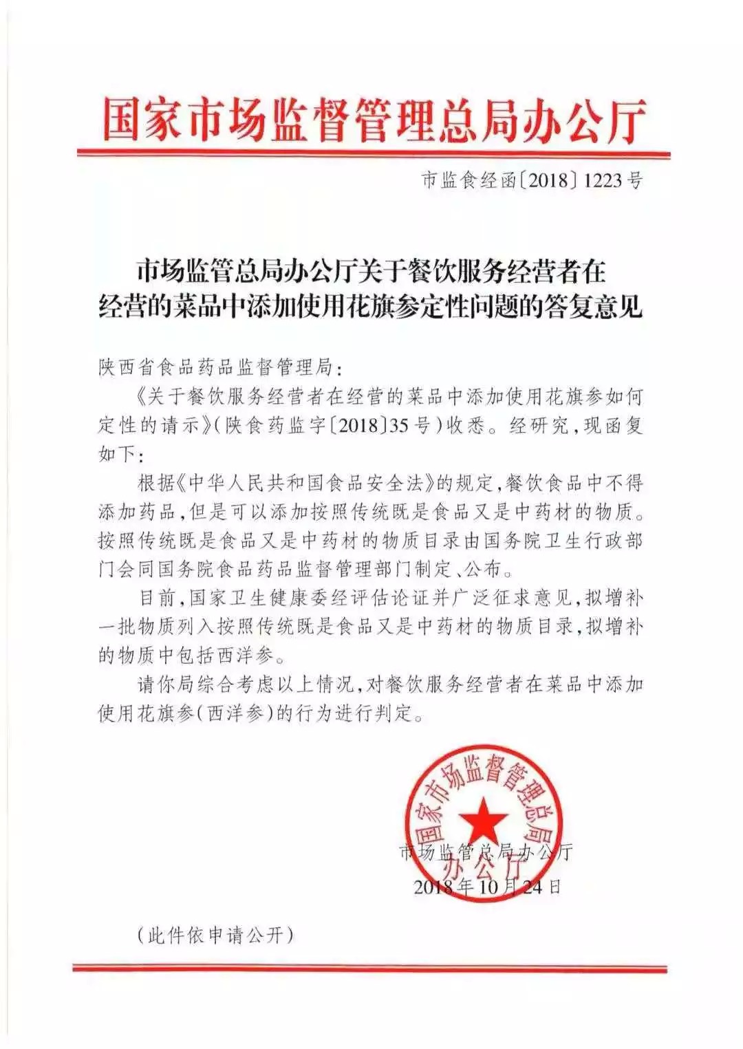 市場監(jiān)管總局辦公廳關(guān)于餐飲服務(wù)經(jīng)營者在經(jīng)營的菜品中添加使用花旗參定性問題的答復(fù)意見