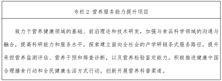 2.創(chuàng)新營養(yǎng)健康服務(wù),引導(dǎo)營養(yǎng)健康產(chǎn)業(yè)發(fā)展。以提高營養(yǎng)健康產(chǎn)品研發(fā)能力為目標(biāo),支持地方建設(shè)營養(yǎng)創(chuàng)新平臺和營養(yǎng)重點(diǎn)實(shí)驗(yàn)室,探索建立面向全社會的產(chǎn)學(xué)研鏈條式服 務(wù)路徑,解析不同人群特殊營養(yǎng)需求,有針對性地推動食品研發(fā)創(chuàng)新,持續(xù)提升產(chǎn)品健康內(nèi)涵。加大力度創(chuàng)新加工技術(shù)工藝,加快促進(jìn)食品加工營養(yǎng)化轉(zhuǎn)型。提升營養(yǎng)監(jiān)測評估、營養(yǎng)干預(yù)和篩查診斷以及營養(yǎng)檢驗(yàn)鑒定能力,逐步構(gòu)建形成我國營養(yǎng)評價技術(shù)與監(jiān)測網(wǎng)絡(luò)體系。推進(jìn)體醫(yī)融合發(fā)展,加強(qiáng)產(chǎn)業(yè)指導(dǎo),規(guī)范市場秩序,促進(jìn)生產(chǎn)、消費(fèi)、營養(yǎng)、健康綠色協(xié)調(diào)發(fā)展,構(gòu)建以預(yù)防為主、防治結(jié)合的營養(yǎng)運(yùn)動健康管理模式。創(chuàng)新營養(yǎng)科普信息表達(dá)形式,針對性拓展傳播渠道,建立免費(fèi)共享的營養(yǎng)科普平臺,定向、精準(zhǔn)地將科普信息普及到全民。