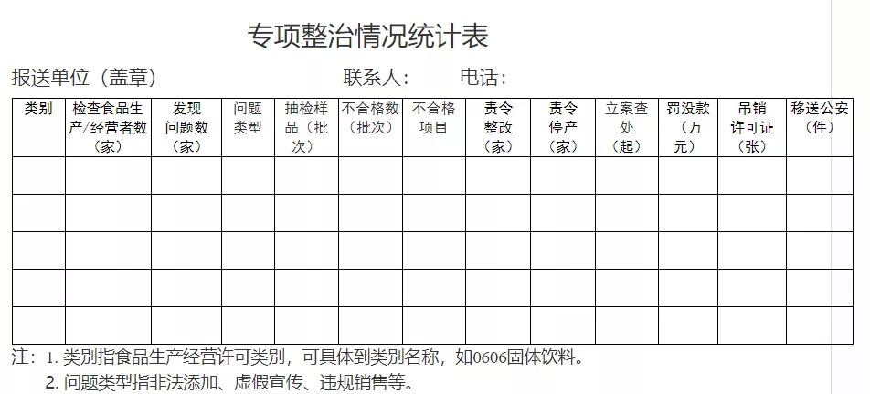 請各地市場監(jiān)管部門將專項(xiàng)整治的基本情況、主要做法、典型案例、發(fā)現(xiàn)問題及原因分析、制度建設(shè)及工作建議等形成報(bào)告,以及統(tǒng)計(jì)表(見附件)的電子版、紙質(zhì)版,于2020年12月10日前報(bào)送總局食品生產(chǎn)司。