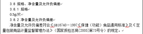 備案申請人應按照《保健(功能)食品通用標準》(GB 16740-1997)及《定量包裝商品計量監(jiān)督管理辦法》(國家質(zhì)檢總局[2005]第75號令)的規(guī)定,標示產(chǎn)品的規(guī)格,并規(guī)定產(chǎn)品凈含量及允許負偏差,凈含量的單位可標示為g/盒、mL/盒、g/袋等。