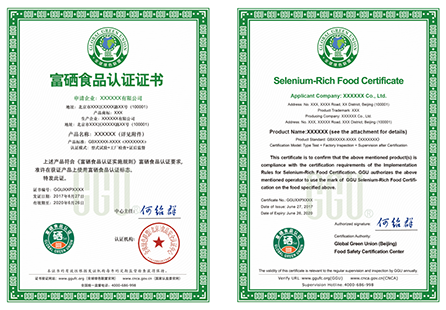 富硒食品認(rèn)證證書(shū)(中英文版)