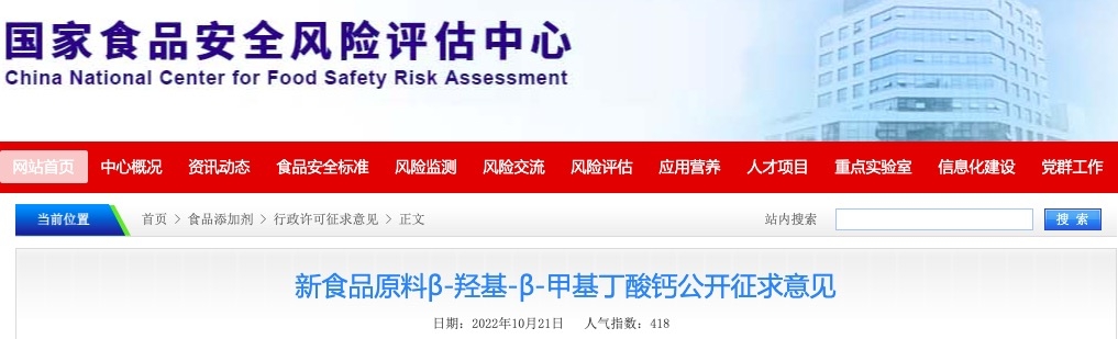 國(guó)家衛(wèi)生健康委員會(huì)委托,根據(jù)《食品安全法》和《新食品原料安全性審查管理辦法》的規(guī)定,β-羥基-β-甲基丁酸鈣申報(bào)新食品原料已通過(guò)專家評(píng)審委員會(huì)技術(shù)審查,現(xiàn)公開(kāi)征求意見(jiàn),請(qǐng)于2022年11月21日前將意見(jiàn)反饋至我中心,逾期將不予處理。