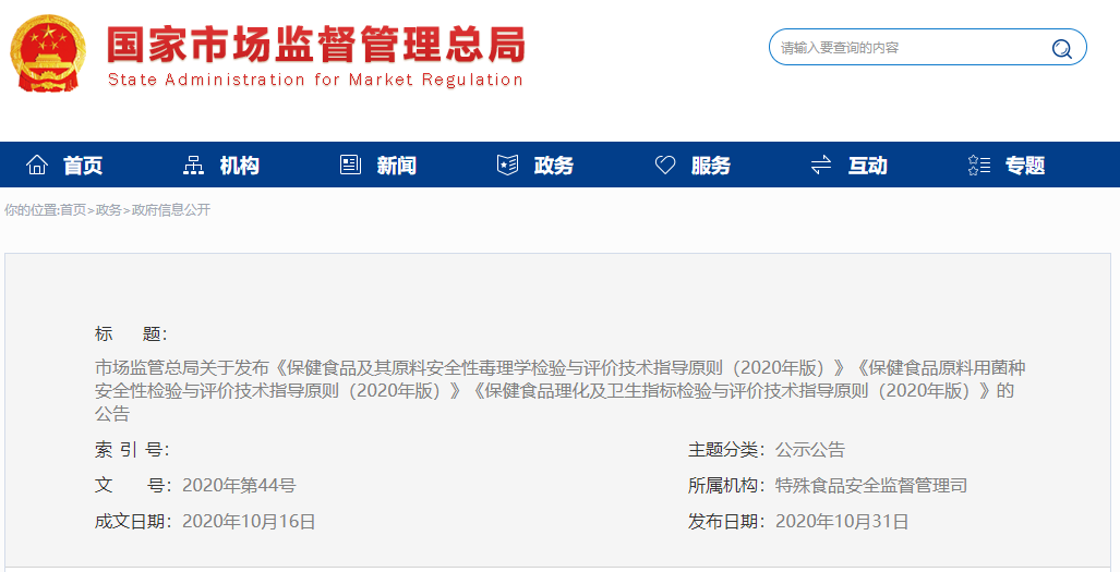 根據(jù)《中華人民共和國(guó)食品安全法》,經(jīng)與國(guó)家衛(wèi)生健康委協(xié)商一致,市場(chǎng)監(jiān)管總局制定了《保健食品及其原料安全性毒理學(xué)檢驗(yàn)與評(píng)價(jià)技術(shù)指導(dǎo)原則(2020年版)》《保健食品原料用菌種安全性檢驗(yàn)與評(píng)價(jià)技術(shù)指導(dǎo)原則(2020年版)》《保健食品理化及衛(wèi)生指標(biāo)檢驗(yàn)與評(píng)價(jià)技術(shù)指導(dǎo)原則(2020年版)》,現(xiàn)予印發(fā),自公告之日起施行。