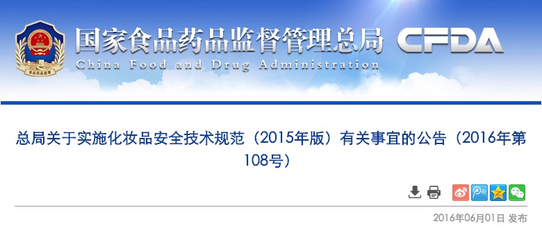 總局關(guān)于實(shí)施化妝品安全技術(shù)規(guī)范(2015年版)有關(guān)事宜的公告(2016年第108號(hào))