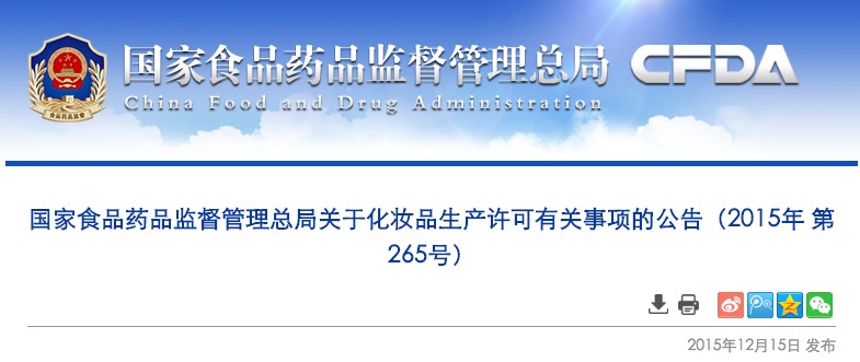 國家食品藥品監(jiān)督管理總局關(guān)于化妝品生產(chǎn)許可有關(guān)事項(xiàng)的公告(2015年 第265號)