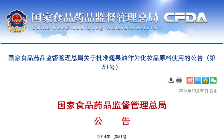 國家食品藥品監(jiān)督管理總局關于批準翅果油作為化妝品原料使用的公告(第51號)