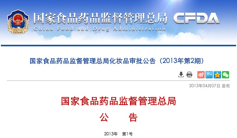 國(guó)家食品藥品監(jiān)督管理總局化妝品審批公告(2013年第2期)