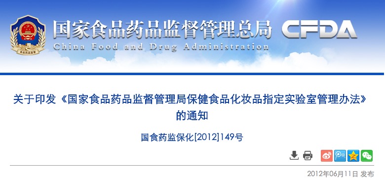 第十六條 實驗室統(tǒng)一命名為“國家食品藥品監(jiān)督管理局保健食品XX指定實驗室”,英文名稱為“Designated Laboratory of XX,State Food and Drug Administration”;“國家食品藥品監(jiān)督管理局化妝品XX指定實驗室”,英文名稱為“Designated Laboratory of XX,State Food and Drug Administration”。