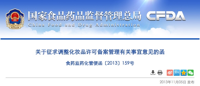為進(jìn)一步加強(qiáng)化妝品許可及備案管理工作,保障消費(fèi)者健康權(quán)益,我司組織起草了《關(guān)于調(diào)整化妝品許可備案管理有關(guān)事宜的通知》(征求意見(jiàn)稿)。現(xiàn)公開(kāi)征求意見(jiàn),請(qǐng)于2013年11月12日前將有關(guān)意見(jiàn)反饋我司。