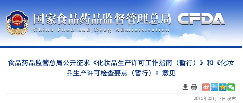 為進(jìn)一步加強(qiáng)化妝品生產(chǎn)監(jiān)管,保障化妝品質(zhì)量安全,按照《國(guó)務(wù)院辦公廳關(guān)于印發(fā)國(guó)家食品藥品監(jiān)督管理總局主要職責(zé)內(nèi)設(shè)機(jī)構(gòu)和人員編制規(guī)定的通知》(國(guó)辦發(fā)〔2013〕24號(hào))和《國(guó)家食品藥品監(jiān)督管理總局關(guān)于公布實(shí)行生產(chǎn)許可制度管理的食品化妝品目錄的公告》(2014年第14號(hào))的相關(guān)要求,依據(jù)化妝品監(jiān)督管理有關(guān)法規(guī),國(guó)家食品藥品監(jiān)督管理總局經(jīng)過(guò)深入調(diào)研論證,并根據(jù)各方面意見和建議修改完善,形成了《化妝品生產(chǎn)許可工作指南(暫行)》和《化妝品生產(chǎn)許可檢查要點(diǎn)(暫行)》,現(xiàn)向社會(huì)公開征求意見。