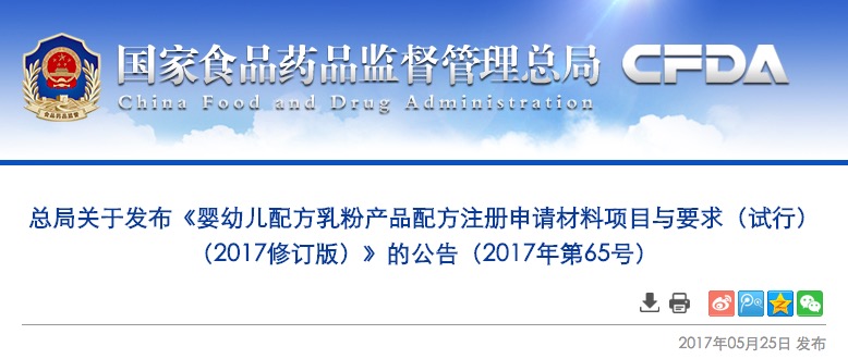 總局關(guān)于發(fā)布《嬰幼兒配方乳粉產(chǎn)品配方注冊(cè)申請(qǐng)材料項(xiàng)目與要求(試行)(2017修訂版)》的公告(2017年第65號(hào))