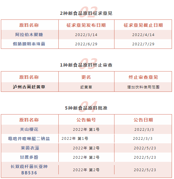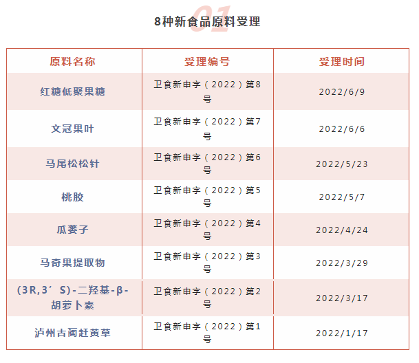 2022年1-7月,國家衛(wèi)生健康委員會共受理瀘州古藺趕黃草、馬尾松松針、桃膠、紅糖低聚果糖等8種新食品原料;對假腸膜明串珠菌、 阿拉伯木聚糖2種新食品原料進(jìn)行意見征求;批準(zhǔn)5種新食品原料,分別是關(guān)山櫻花、吡咯并喹啉醌二鈉鹽、萊茵衣藻、長雙歧桿菌長亞種BB536、甘蔗多酚;不予行政許可的新食品原料有3種,分別是牛樟芝菌絲體粉、異麥芽糊精、玉米發(fā)酵物。