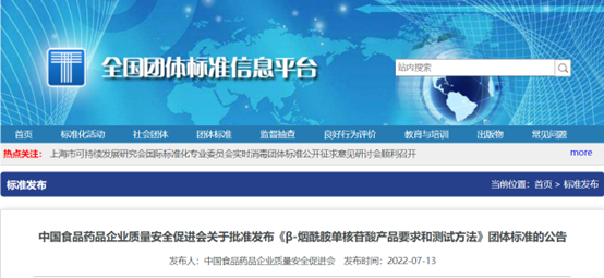 2022年7月13日,中國食品藥品企業(yè)質(zhì)量安全促進(jìn)會發(fā)布β-煙酰胺單核苷酸(NMN)產(chǎn)品要求和測試方法團(tuán)體標(biāo)準(zhǔn),適用于進(jìn)出口原料β-煙酰胺單核苷酸產(chǎn)品的質(zhì)量控制,將于2022年8月12日正式實(shí)施。這是國內(nèi)首個NMN產(chǎn)品標(biāo)準(zhǔn)正式公布,填補(bǔ)了國內(nèi)空白。
