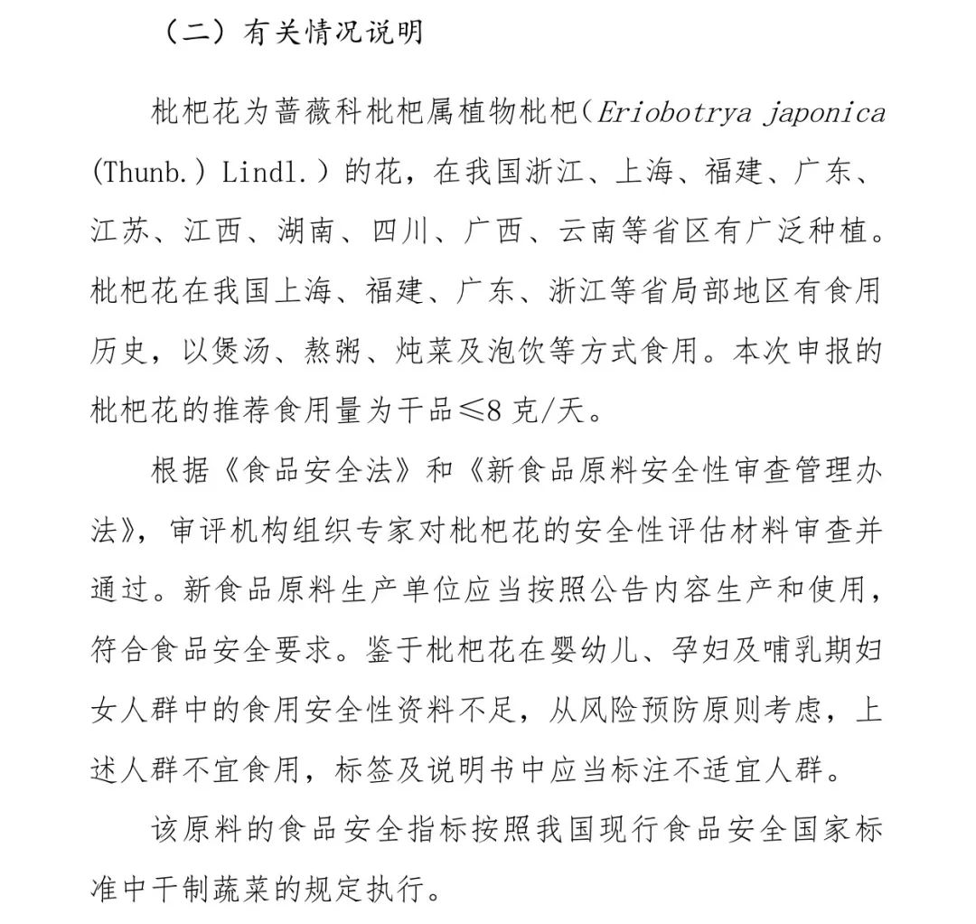 受國家衛(wèi)生健康委員會(huì)委托,根據(jù)《食品安全法》和《新食品原料安全性審查管理辦法》的規(guī)定,近期枇杷花已通過專家評(píng)審委員會(huì)技術(shù)審查,現(xiàn)公開征求意見,請(qǐng)于2018年12月7日前將意見反饋至我中心,逾期將不予處理。
